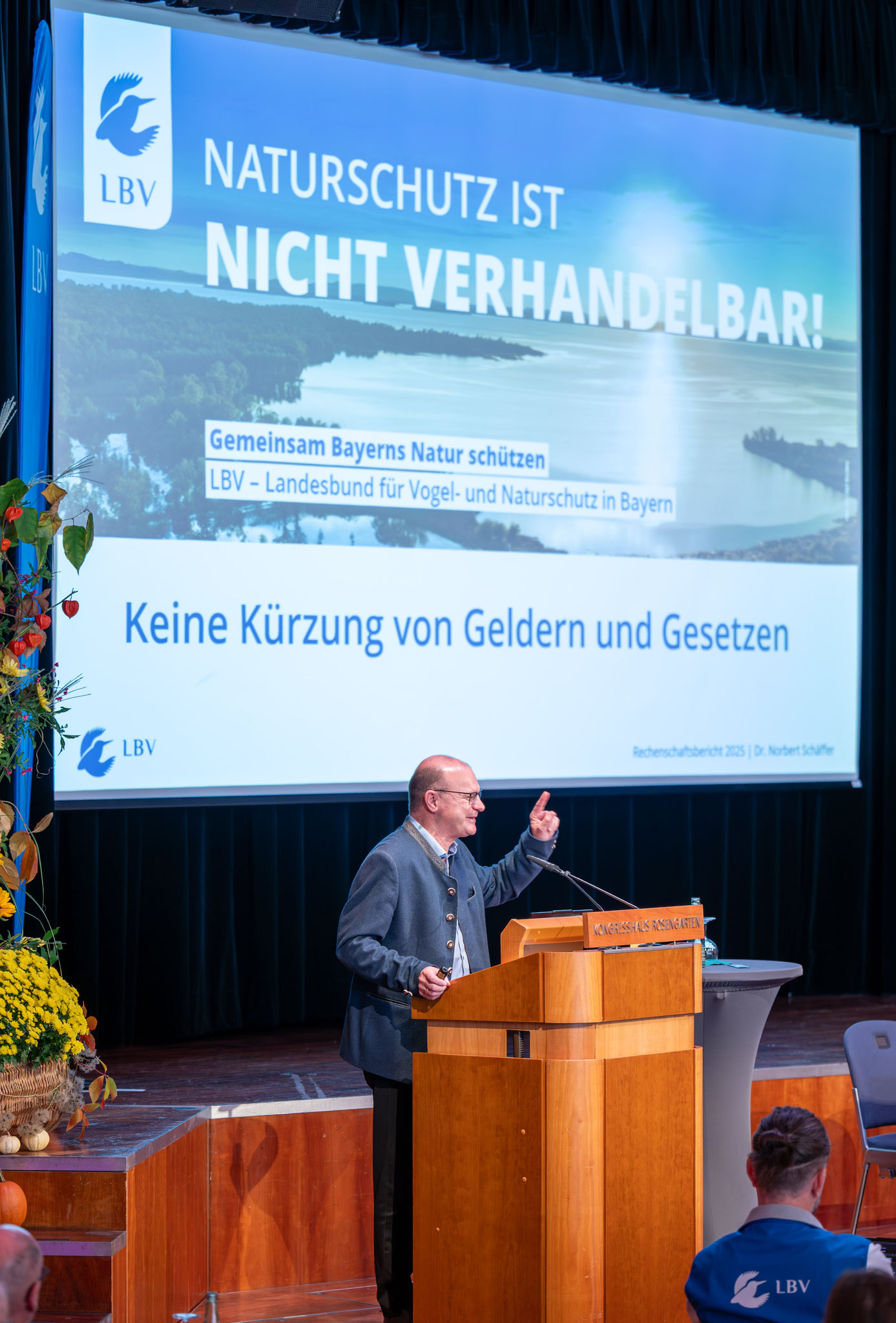 Von ihrer Jahresversammlung senden mehr als 210 LBV-Delegierte das deutliche Signal an die Staatsregierung, den Naturschutz nicht weiter zu schwächen. Auf den Naturschutz in Bayern rollt nach Ansicht des LBV eine bedrohliche Welle zu: Finanzielle Kürzungen und rechtliche Einschränkungen könnten zu einer substanziellen Schwächung des Natur- und Artenschutzes im Freistaat führen und die Erfolge der vergangenen Jahre zerstören. Aus diesem Grund sendet die Delegiertenversammlung als oberstes Gremium des LBV mit einer Resolution unter dem Motto „Naturschutz ist nicht verhandelbar“ ein eindeutiges Zeichen an die Bayerische Staatsregierung. Auf ihrem diesjährigen Treffen in Coburg verurteilten Naturschützerinnen und Naturschützer aus ganz Bayern sowohl die drohenden massiven Einsparungen von Geldern für den Naturschutz im kommenden Doppelhaushalt als auch die Rücknahmen oder Beschränkungen in verschiedenen Verordnungen und Gesetzen. „Trotz einiger Fortschritte seit dem erfolgreichen Volksbegehren Artenvielfalt - ‚Rettet die Bienen!‘ 2019 würden durch die geplanten massiven Mittelkürzungen im Haushalt wichtige Maßnahmen nicht umgesetzt und gesetzlich verankerte Naturschutzziele nicht erreicht. Besonders gefährdet wären zentrale Errungenschaften des Volksbegehrens sowie das EU-Gesetz zur Wiederherstellung der Natur“, sagt der LBV-Vorsitzende Dr. Norbert Schäffer.