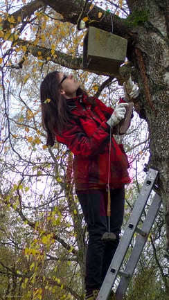 Wir hatten eine auf neun Meter ausziehbare Leiter dabei. Die Nistkästen hängen unterschiedlich hoch, da sich die verschiedene Tiere in verschiedenen Höhen wohlfühlen. Manchmal hat ein Nistkasten auf sechs Meter über dem Boden aber auch einen anderen Grund, so hoch zu hängen: Am Abenteuerspielplatz in Markt Schwaben fanden es Jugendliche lustig, die Kästen mit Stöcken runterzuholen. So können die Kästen auch kaputt gehen. Mittlerweile hängen alle sehr hoch, da die Tiere auch nicht mehr in Kästen gehen, die ständig gefährdet sind. Ein weiterer wichtiger Aspekt ist die Reinigung des Kasten: Ist der Kasten innen gerade und lässt sich eine Seite komplett öffnen, kann er leicht gereinigt werden. Bei anderen kann der Fledermauskot direkt unten runter fallen, wodurch diese gar nicht gereinigt werden müssen. Immer wieder testet die Kreisgruppe neue Nistkasten-Modelle. Einige davon haben kleinere Eingänge, um auch den kleinen Arten Wohnraum zu bieten. Dann gibt es große Winterschlafkästen für Fledermäuse, die mit ihrer dicken Wand vor der Kälte schützen oder Rundkästen für Fledermäuse, die Vögeln den Zutritt verwehren sollen. Zudem gibt es längliche Kästen für Nischenbrüter und recht einfache Schalen für Gebäudebrüter. Genauso verschieden, wie die vielen bevorzugten Nistkästen, bauen die einzelnen Vogelarten auch verschiedene Nester: